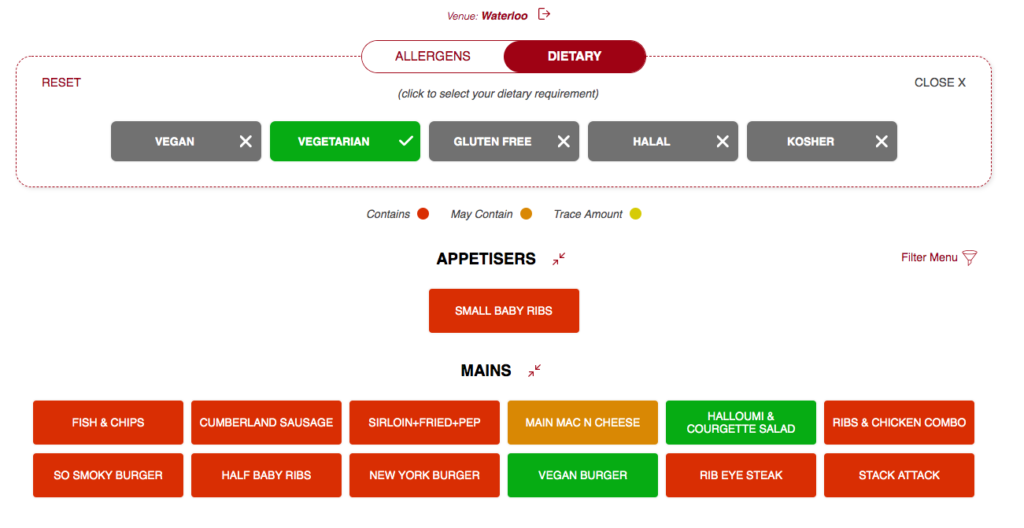 Customers that have made specific dietary choices, such as “gluten free” or “vegan,” can select these in conjunction with their allergies and have the menu display items that fulfil these combined requirements.