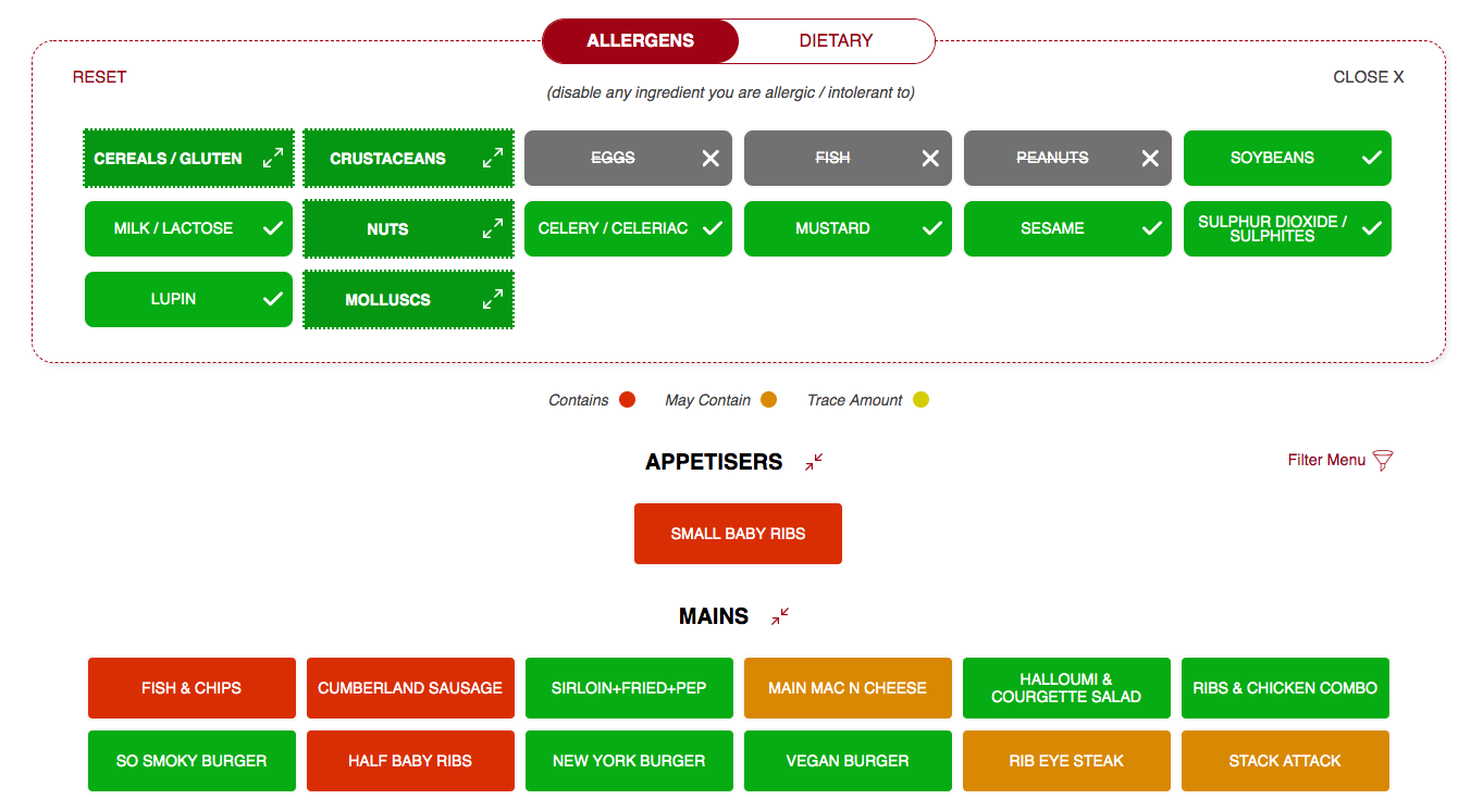 Customers that have made specific dietary choices, such as “gluten free” or “vegan,” can select these in conjunction with their allergies and have the menu display items that fulfil these combined requirements.