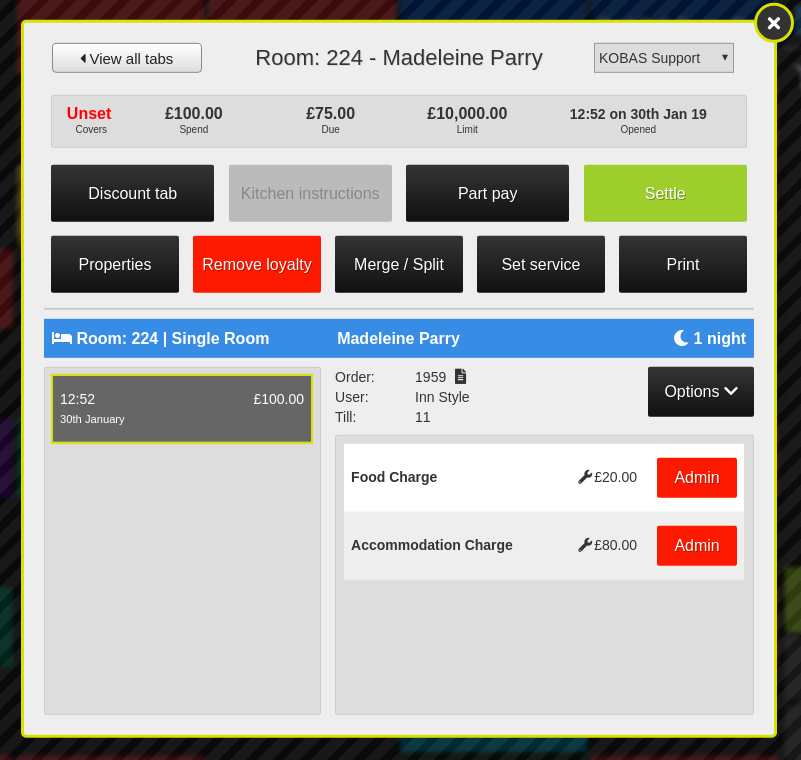 Once activated, anytime a guest is ‘checked-in’ within Inn Style, the information is passed to Kobas. This creates a tab relevant to your venue’s EPoS server, and adds a ‘Room Rate’ to an order on the tab as a normal PLU, as well as any relevant prepayments, such as an Inn Style Voucher (prepaid credit) or Inn Style Payment (deposit for booking).