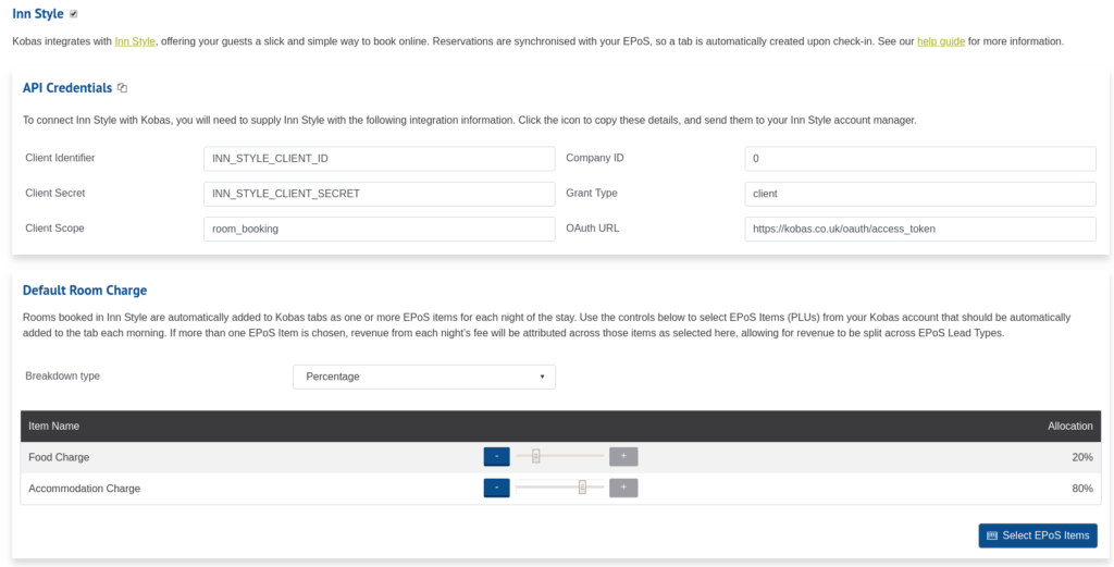 Activating the integration is simple. All you need to do is access Administration > Integrations > Room Booking in Kobas Cloud. Activate the Inn Style section by ticking the checkbox and selecting EPoS items (PLUs) from your Kobas account that should be automatically added to the tab each morning.