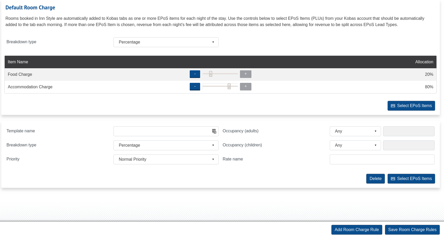 To create a new room rate type, click on Add Room Charge Rule, then, Select EPoS Items. Once you select the EPoS Items, use the controls to allocate the revenue either by Percentage or Value.