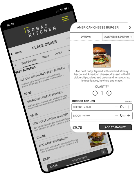 So in 2020 we dropped all other plans and prioritised Version 5, “Online Ordering”, which we launched ahead of Saturday 4th July 2020 as hospitality was allowed to reopen. From home, customers could browse menus, put together a basket and pay online for collection or delivery. From within a venue, customers could scan a QR phone on their own device that would take them straight to the menu, while automatically noting their venue and tab. Kobas online ordering was an essential game-changer, taking our In-Venue systems to the next level.
