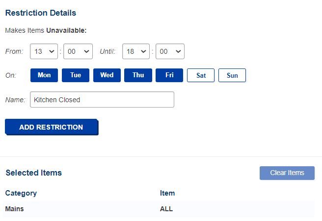 Another use-case we know our clients have, is that their kitchen closes between lunch and dinner service and food is not available for purchase in these times. As the screenshot above shows, the new menu manager Time Restrictions feature allows a user to select item categories, days, and times, and combine them into a restriction where the items are not available.