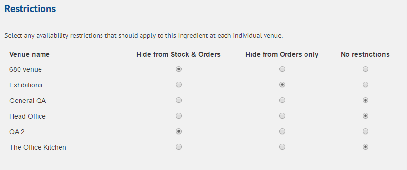 There are now two tiers of restriction that can be applied to an ingredient at any venue. Ingredients can either be restricted from being able to be ordered by a venue, or from being able to be ordered and stock checked by a venue.